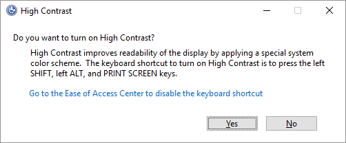 This shortcut key opens a warning window before applying any changes. Click Yes or simply hit Return to switch to the high contrast setting. This will Enlarge the text font and do the contrast high as usual.